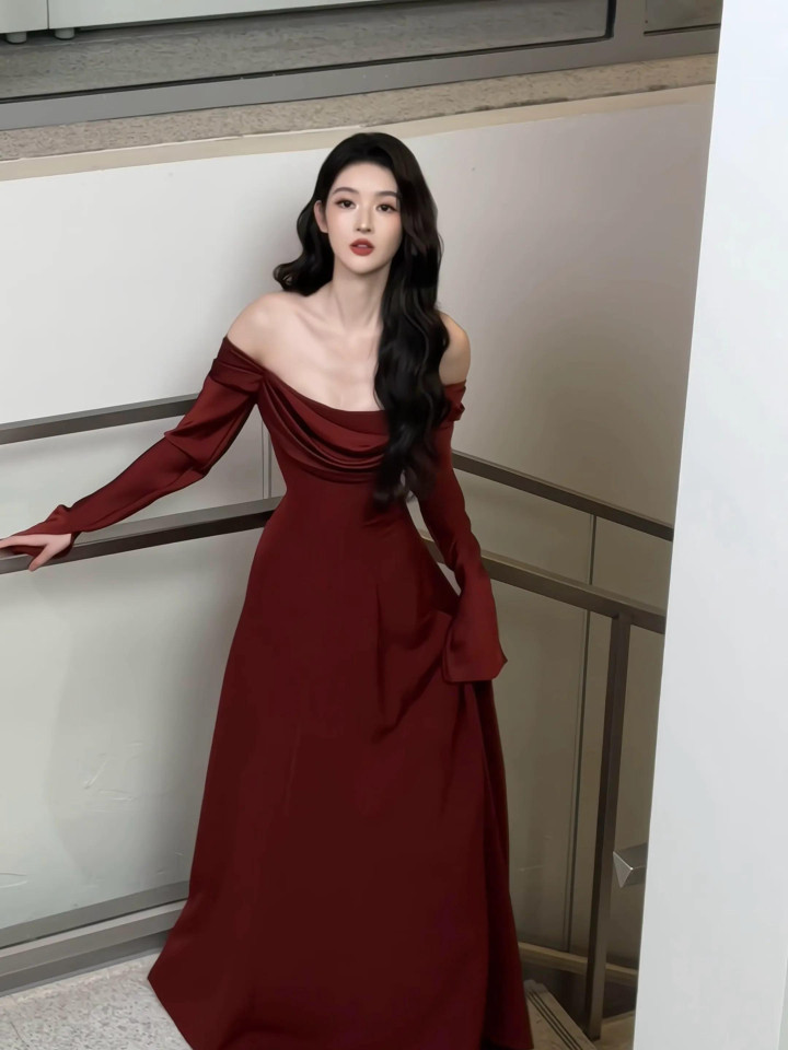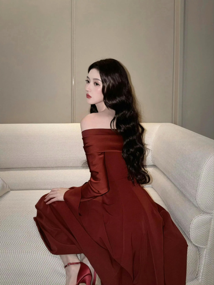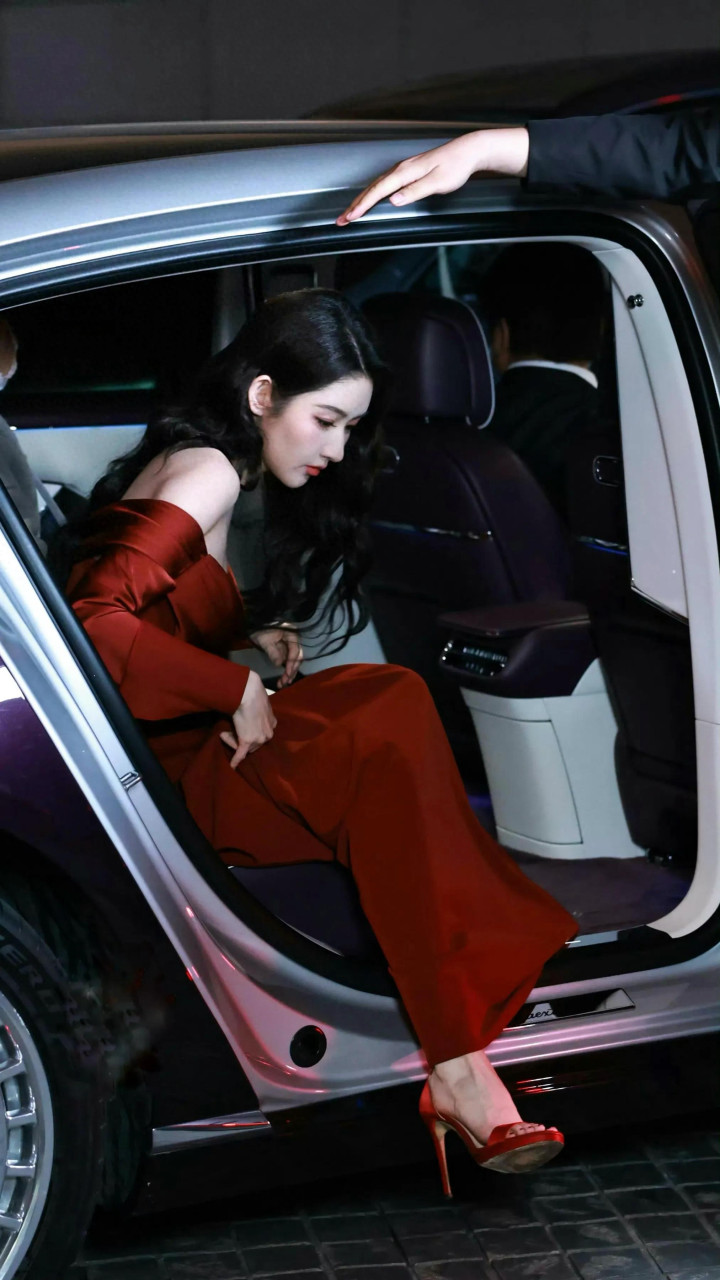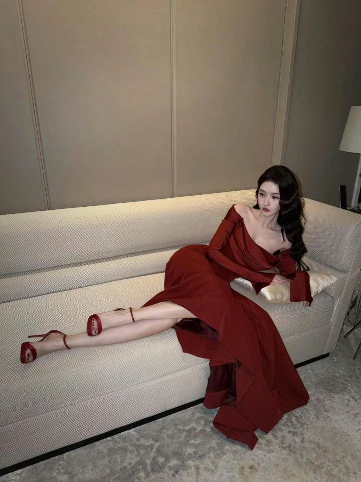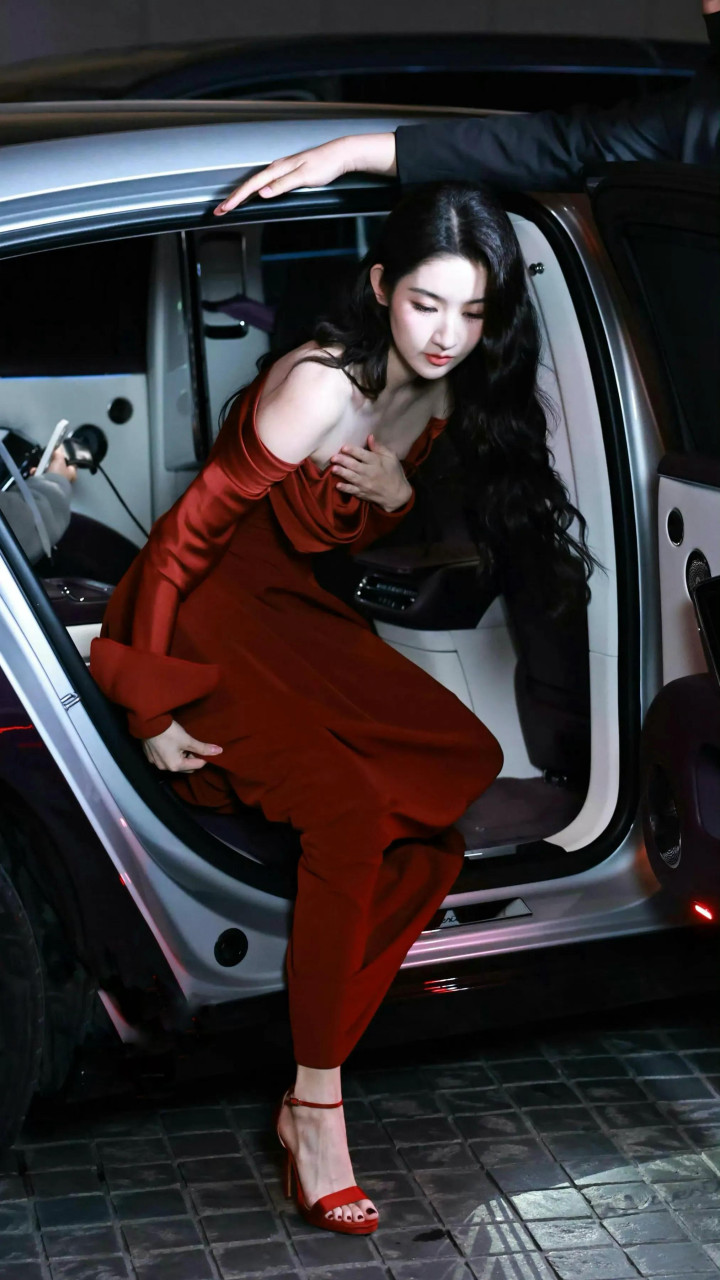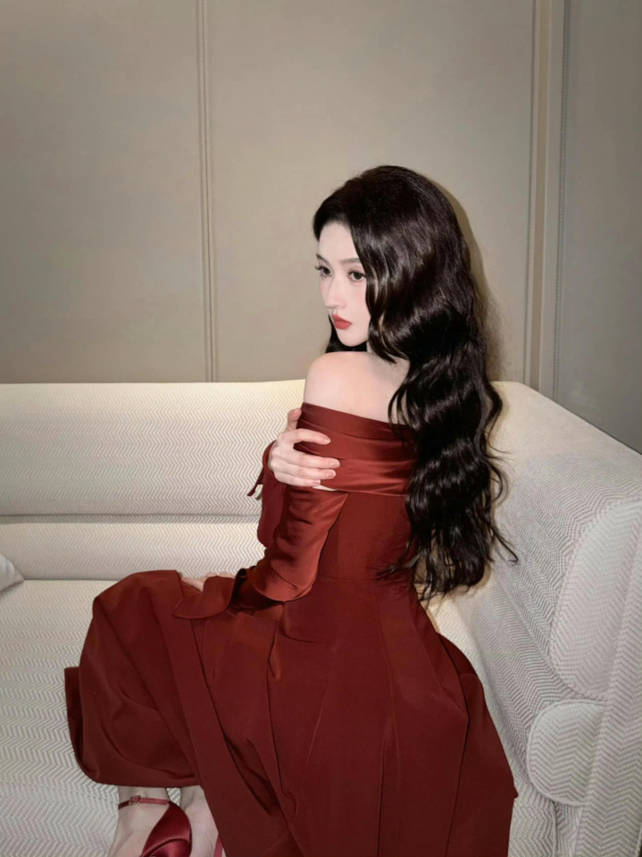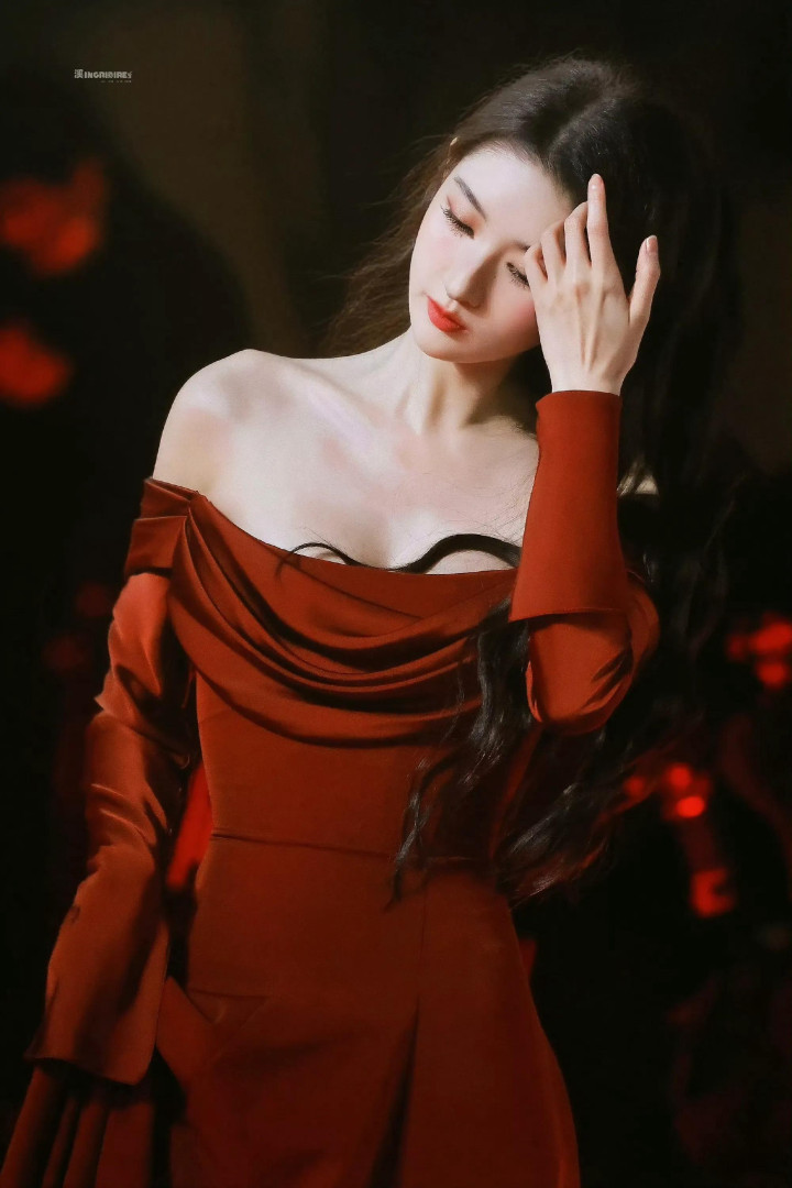 王玉雯露肩大红裙